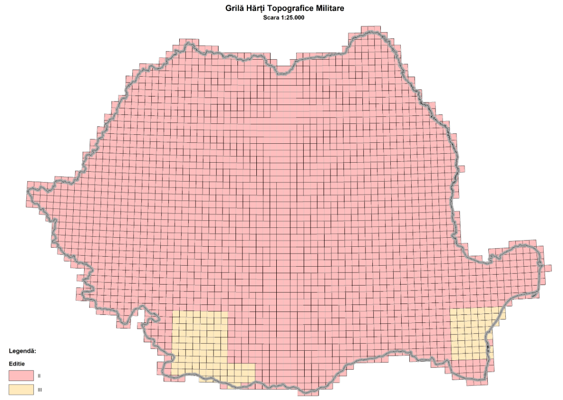 Grila conține contururile secțiunilor hărților topografice militare la scara 1:25.000 la nivel național.
