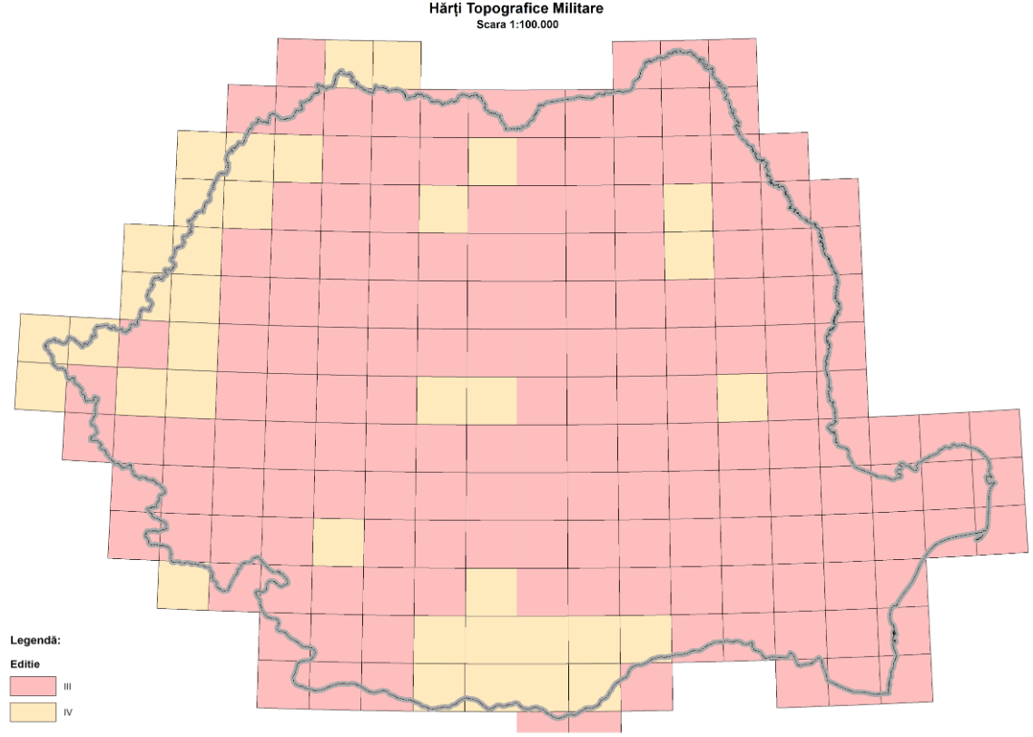 Grila conține contururile secțiunilor hărților topografice militare la scara 1:100.000 la nivel național.